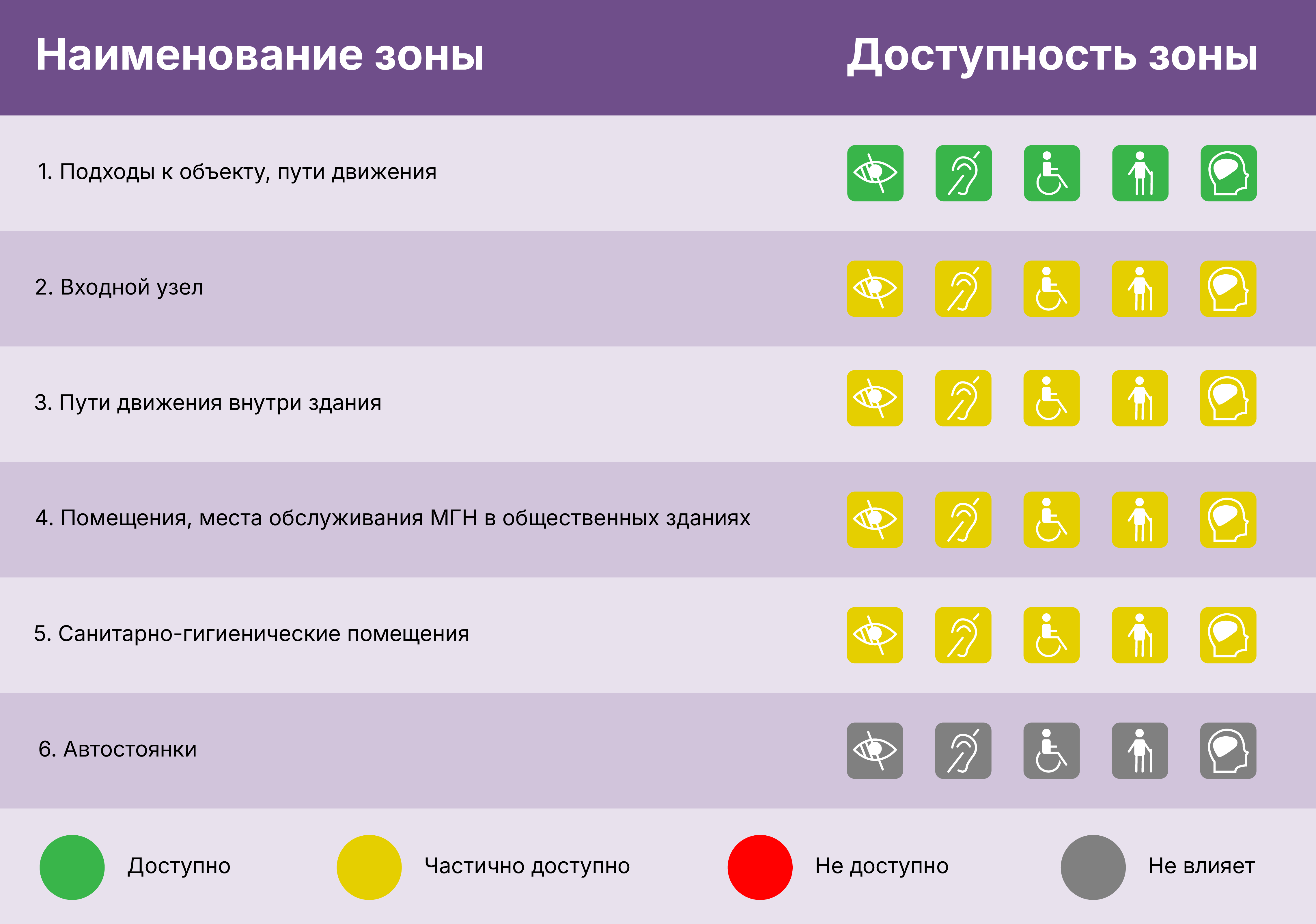Наша организация стремится создать комфортную среду для всех посетителей, в том числе для маломобильных групп населения. Ниже представлена информация о доступности различных зон учреждения для различных категорий инвалидов:
