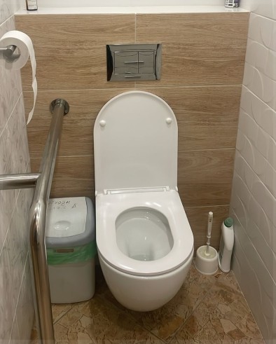 Санитарный узел оборудован вспомогательными поручнями, локтевыми дозаторами, держателем для бумажных полотенец и кнопкой вызова персонала.